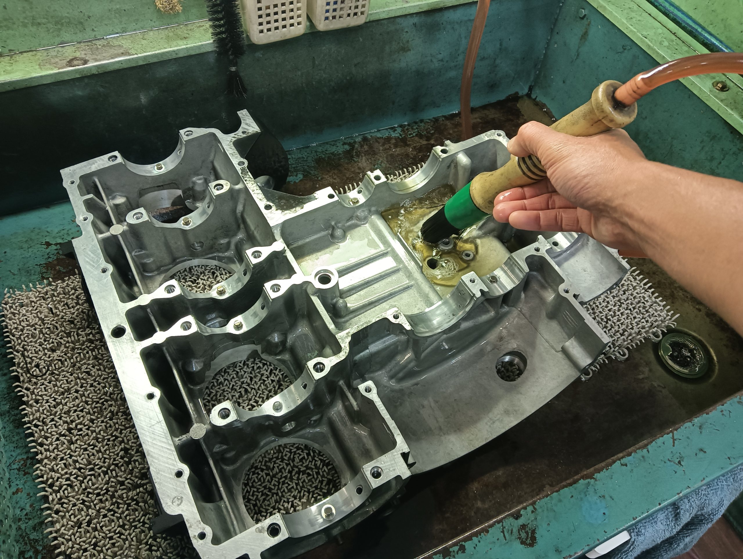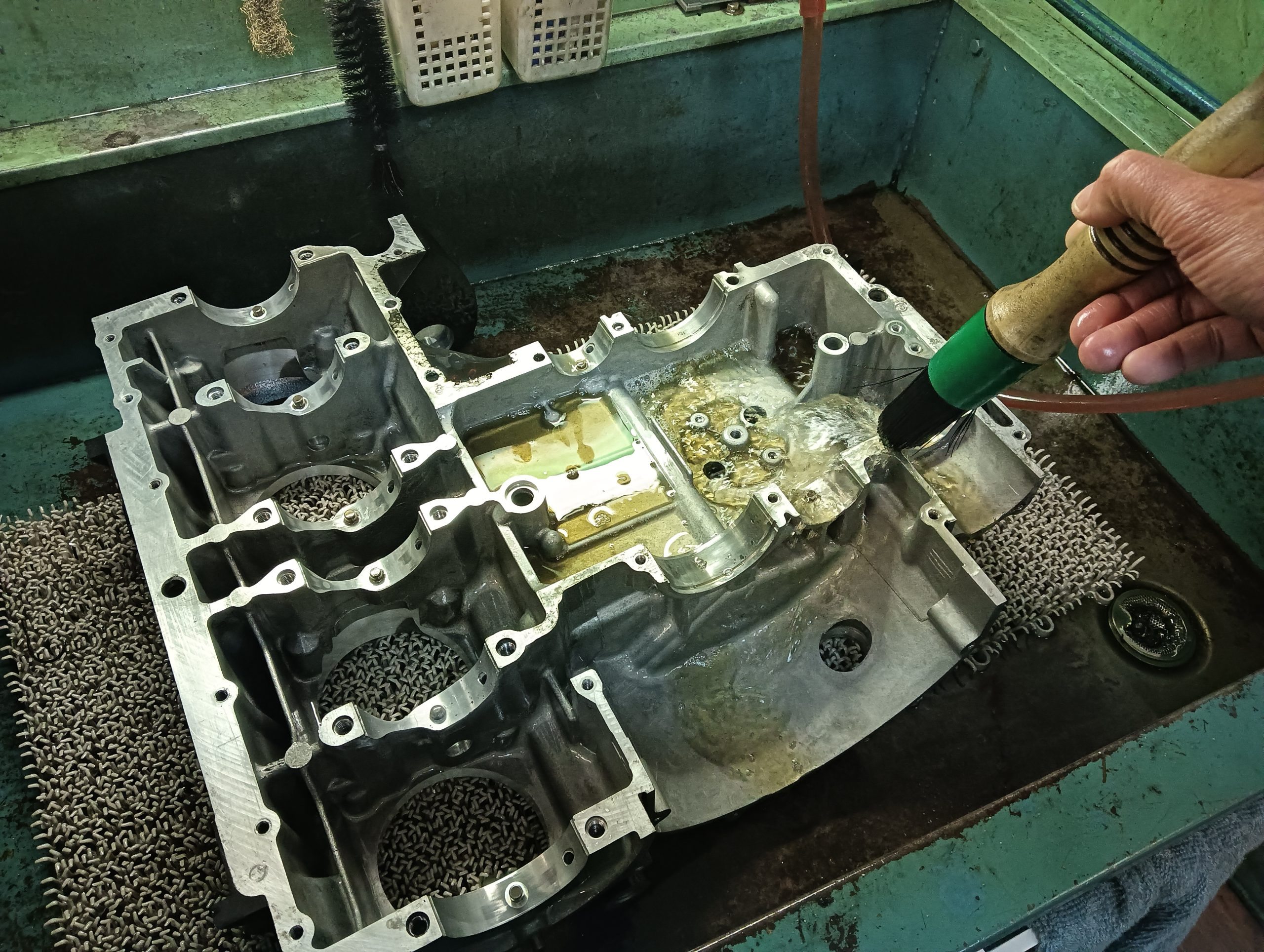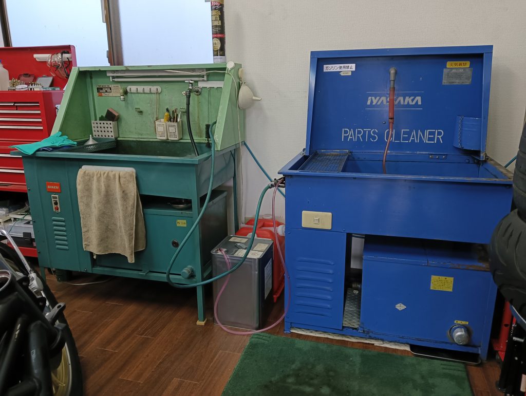 組付け直前の最後の洗浄は、きれいな洗油で洗浄し組付けに入れるように、汚れた部品洗浄専用とエンジン本組専用の二種類を完全に分けて使用しています。
