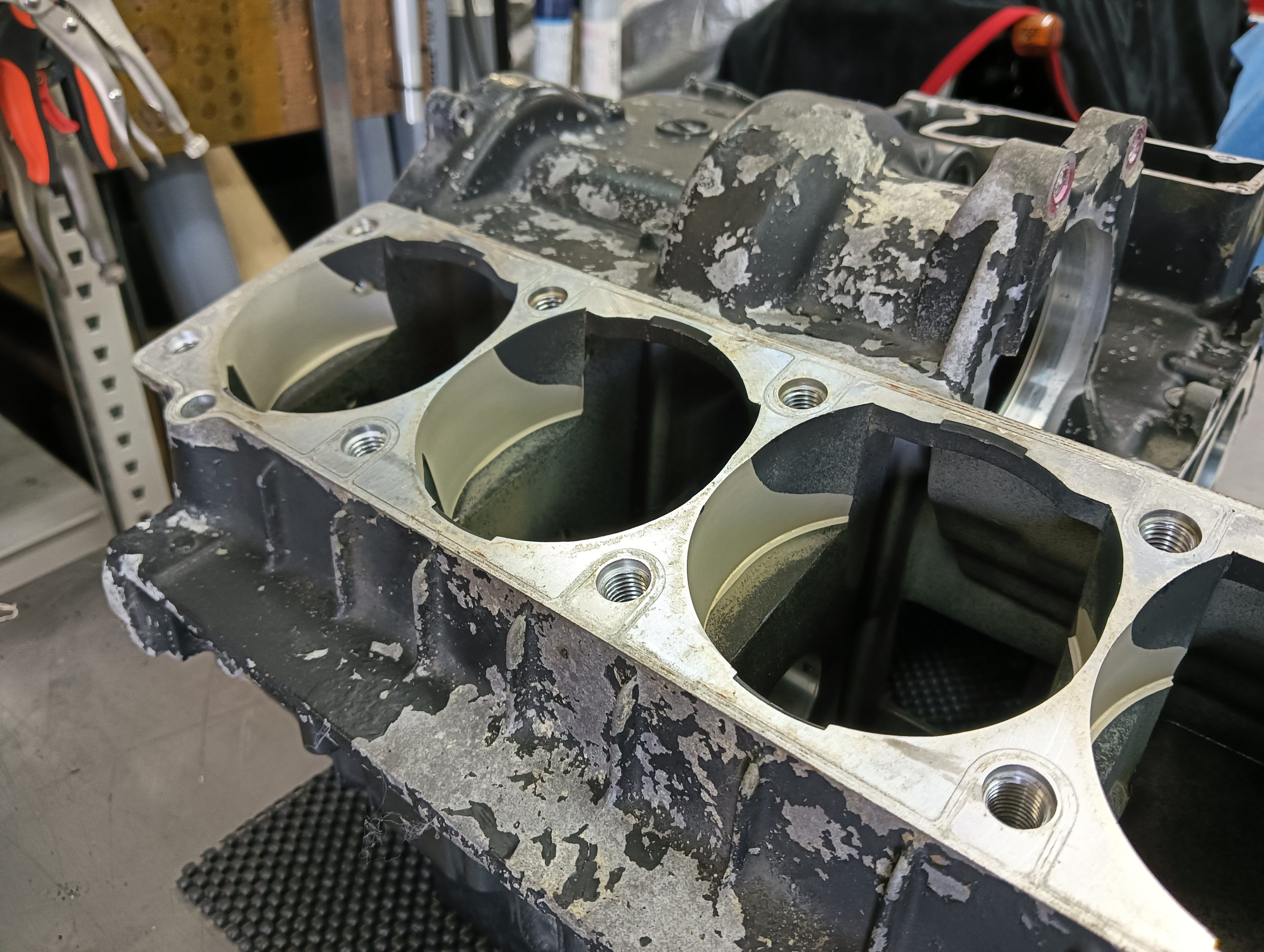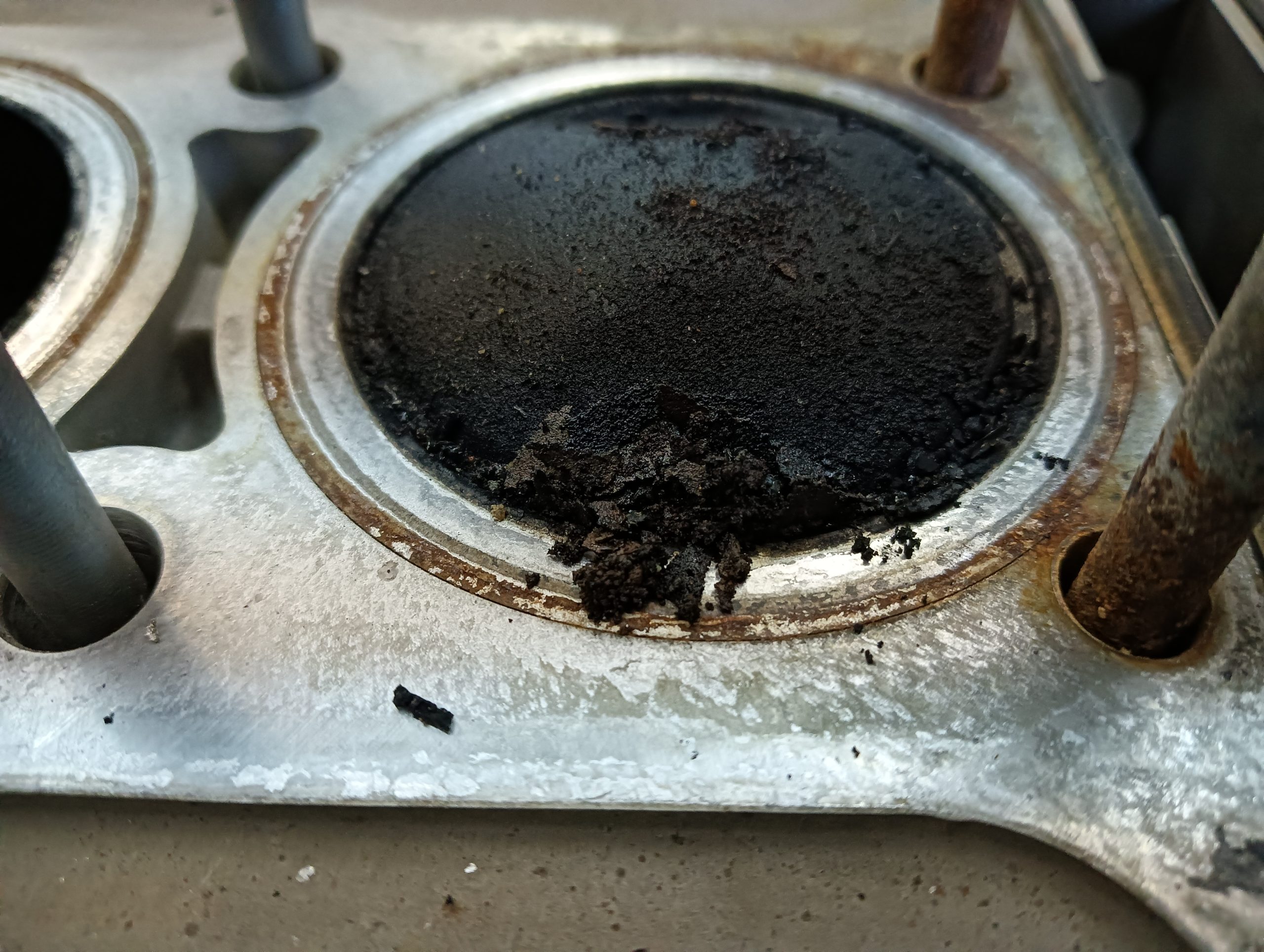 エンジン内部の腐食性ガスなどの影響を受けた金属は、腐食が進んで破断やクラックがある事も多いため、きれいに洗浄しないとしっかりとした内部の点検ができません。