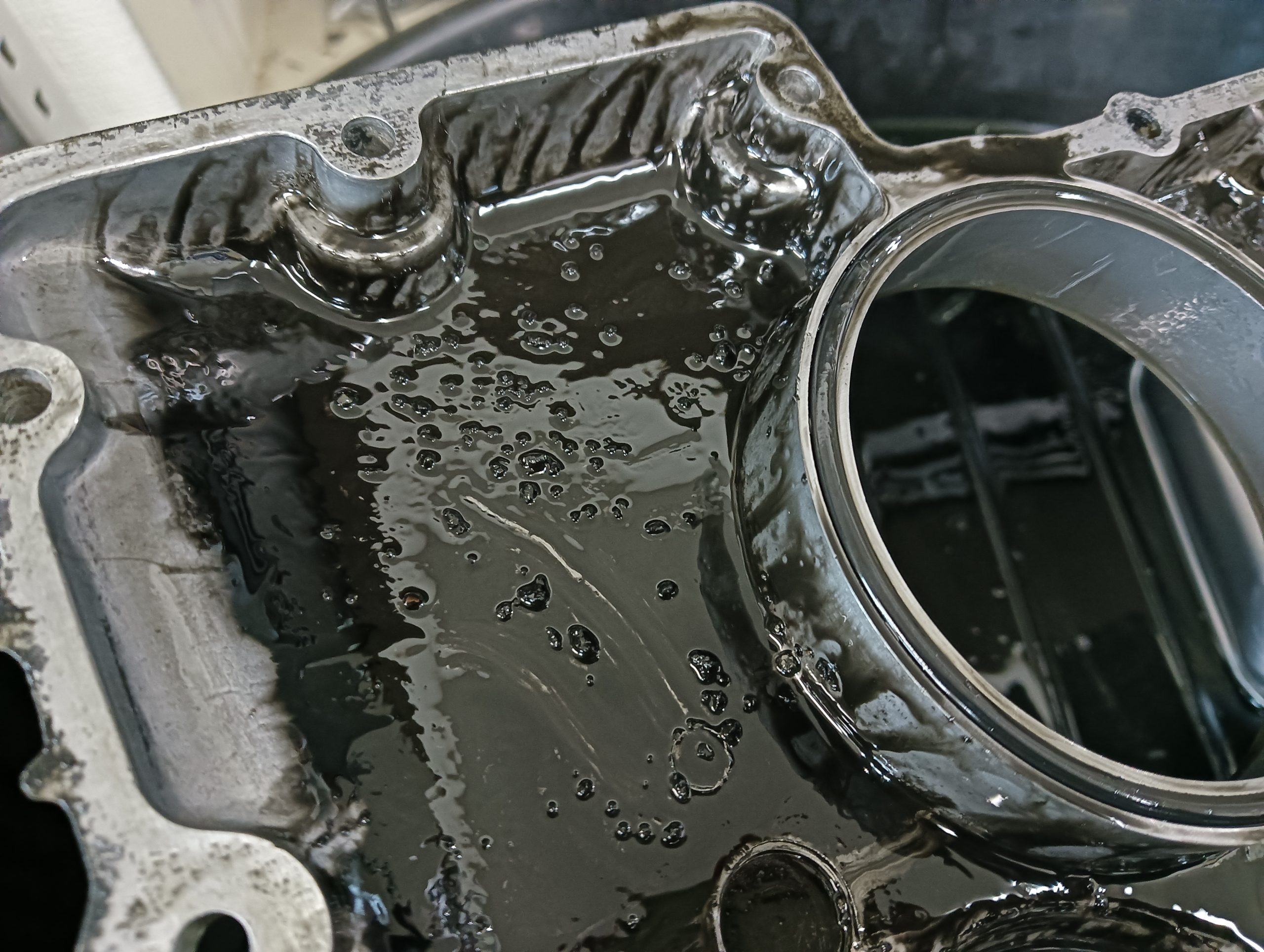 エンジンを分解していくと、特に旧年式車両の内部は、何十年も前からエンジンオイルに蓄積されたスラッジ(汚れ)や、エンジンの外側も滲んだオイルや飛散したケミカルの油分などによって、非常に汚れた状態になっています。